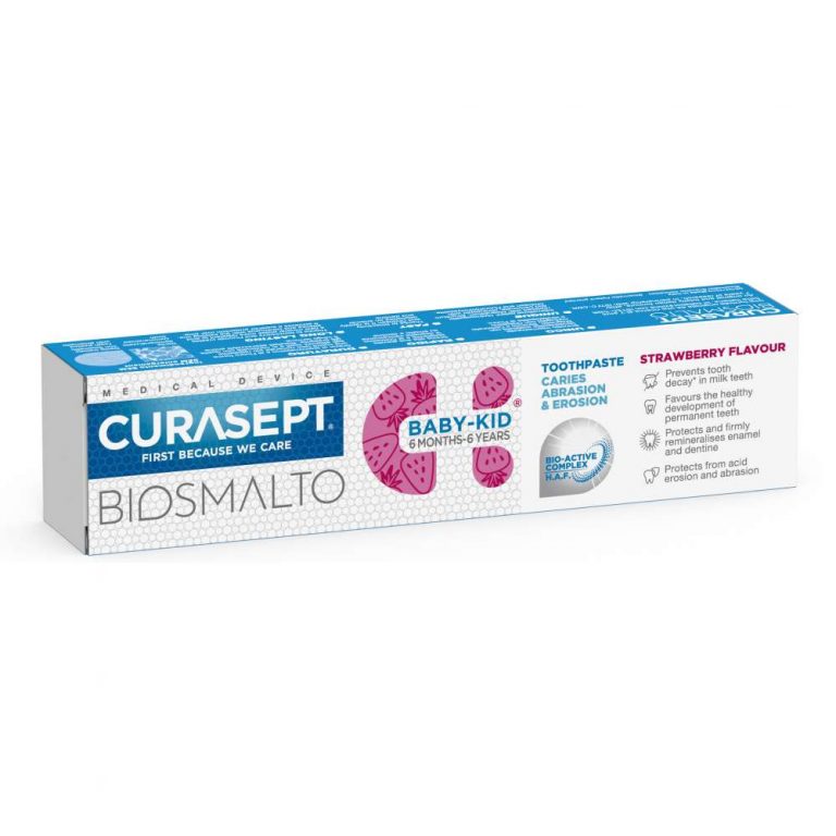 Curasept Biosmalto Baby – Kid dantų pasta: mėtos skonio dantų pasta yra su fluoru, braškių skonio dantų pasta yra su fluoru arba be fluoro. Dantų pasta skirta nuo 6 mėn. mažylių pieninių dantų apsaugai palaikyti bei iki 6 metų vaikų dantų apsaugai nuo karieso, dantų jautrumui bei remineralizacijai. Kūdikiams ir vaikams skirta kasdienė mėtų arba braškių skonio dantų pasta. Fluoro kiekis 1000 ppm, dantų pastos abrazyvumas RDA <30. Be SLS ir alkoholio.